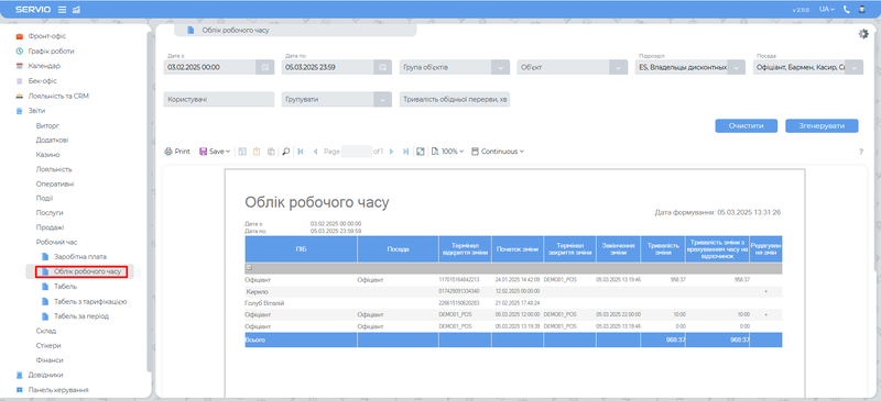 Цей звіт призначений для детального контролю за робочими змінами працівників. Він фіксує час початку і закінчення зміни, тривалість робочого часу, включаючи перерви на відпочинок.