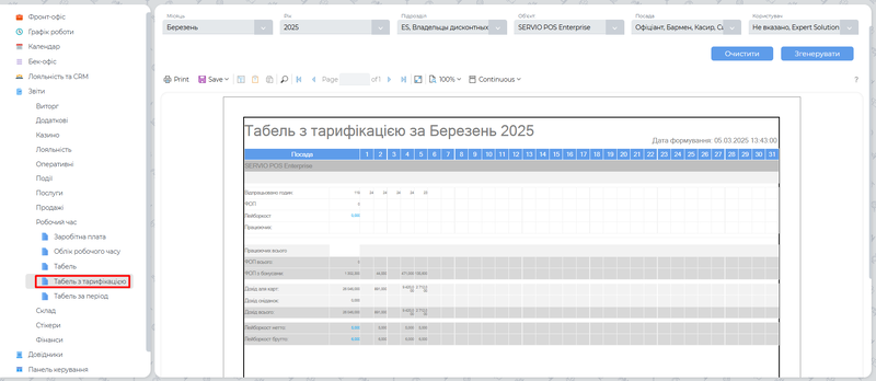 Звіт “Табель з тарифікацією”, містить всі відпрацьовані години працівниками, а також інформацію про їхні тарифні ставки.