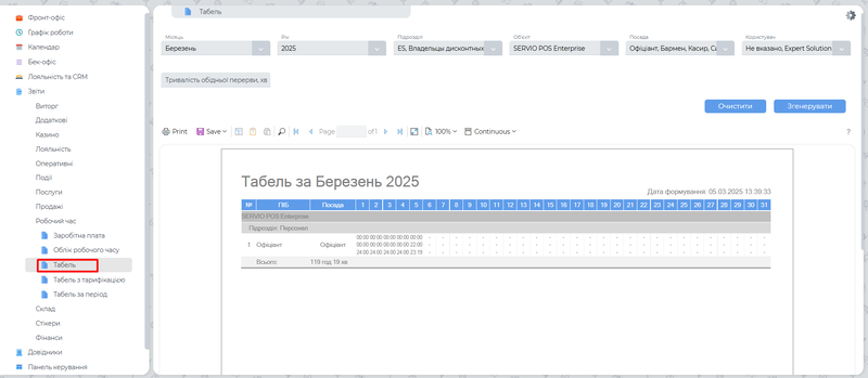З’явиться звіт "Табель" за вказаний місяць. У цьому звіті будуть детально відображені всі працівники, які працювали в обраному періоді, з розподілом за відпрацьованими змінами. Ви побачите інформацію про початок та кінець змін, відпрацьовані години, а також перерви та інші важливі дані для кожного працівника.