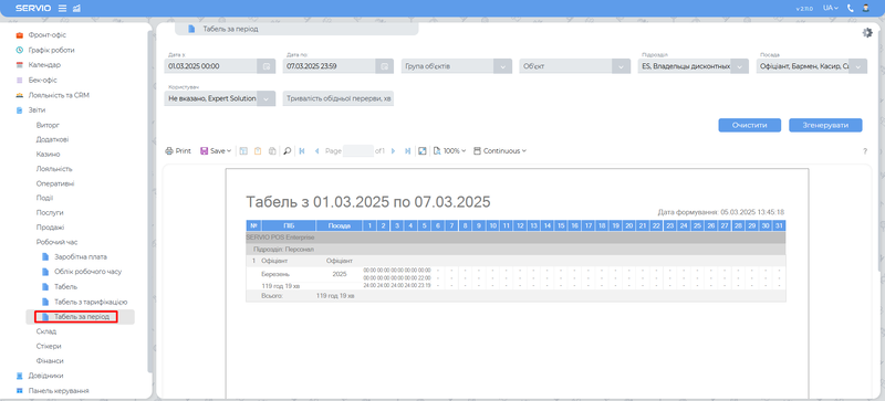 Звіт “Табель за період”, містить всі відпрацьовані зміни працівників за вказаний вами проміжок часу.