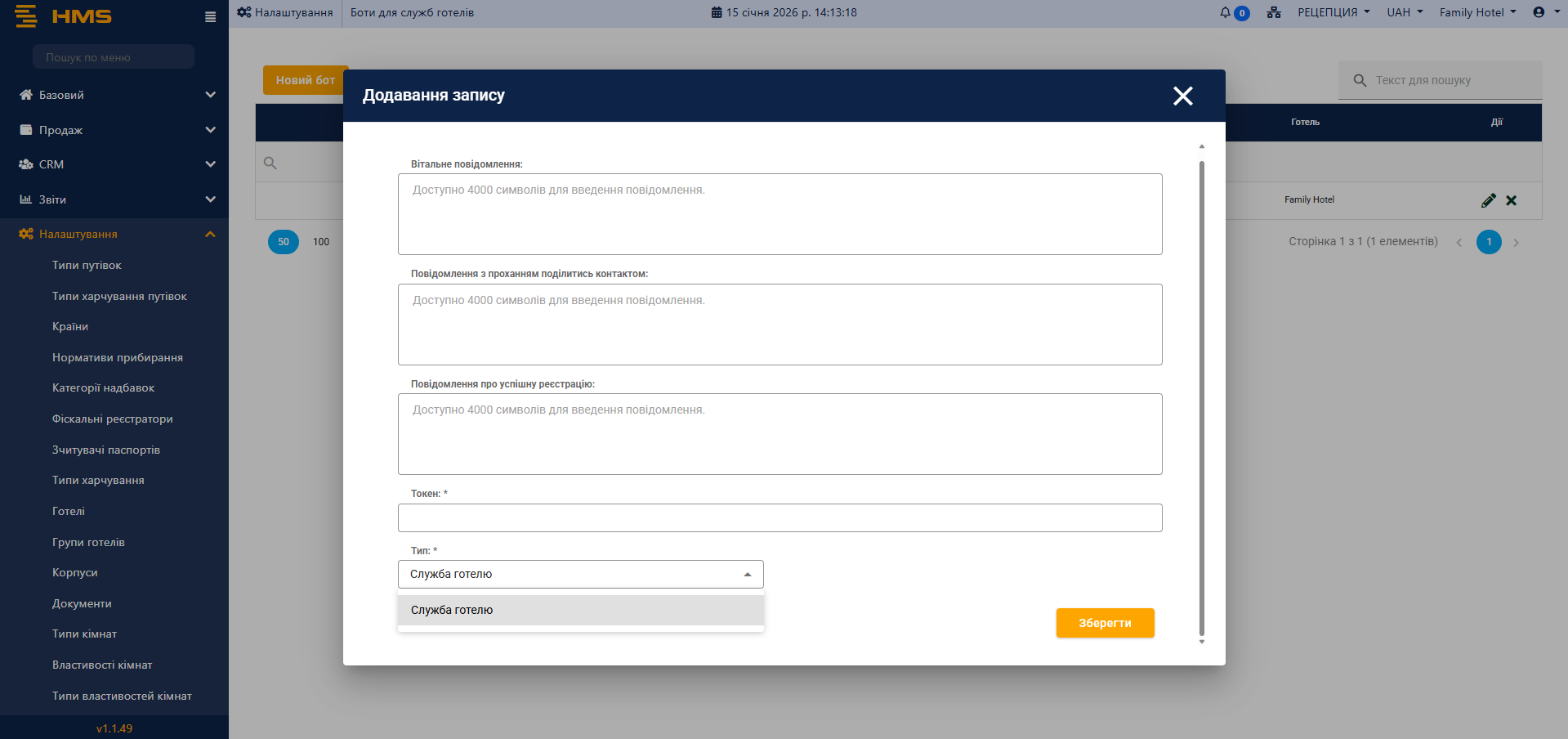 Додавання бота служби готелю