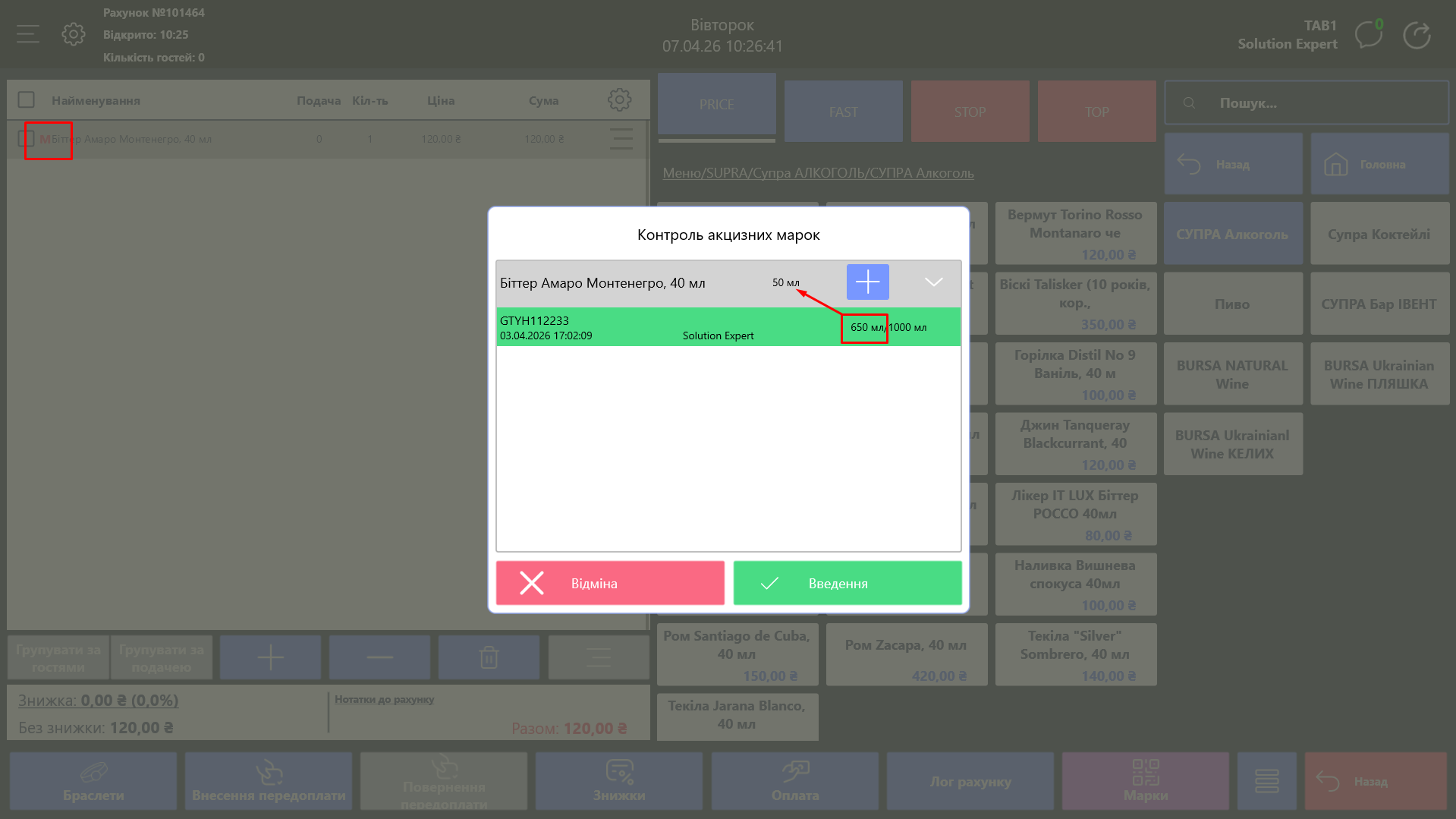 Додаючи тарифну позицію з признаком акцизної марки (біля назви тарифної позиції стоїть червоногокольору позничку) в рахунок списується об`єм порції і у вікні контролю акцизних марок змінюється об`єм залишку автоматично